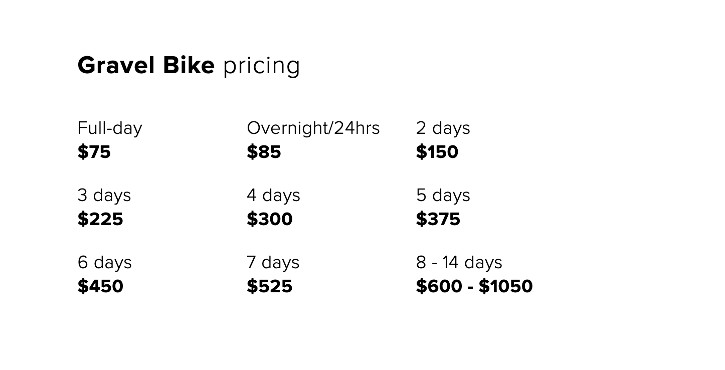 Our gravel bikes are all about having as much fun as possible on the forestry roads & pedalling longer distances. With bigger tires than a road bike, these bikes can take on gravel surfaces and light trails with ease!
